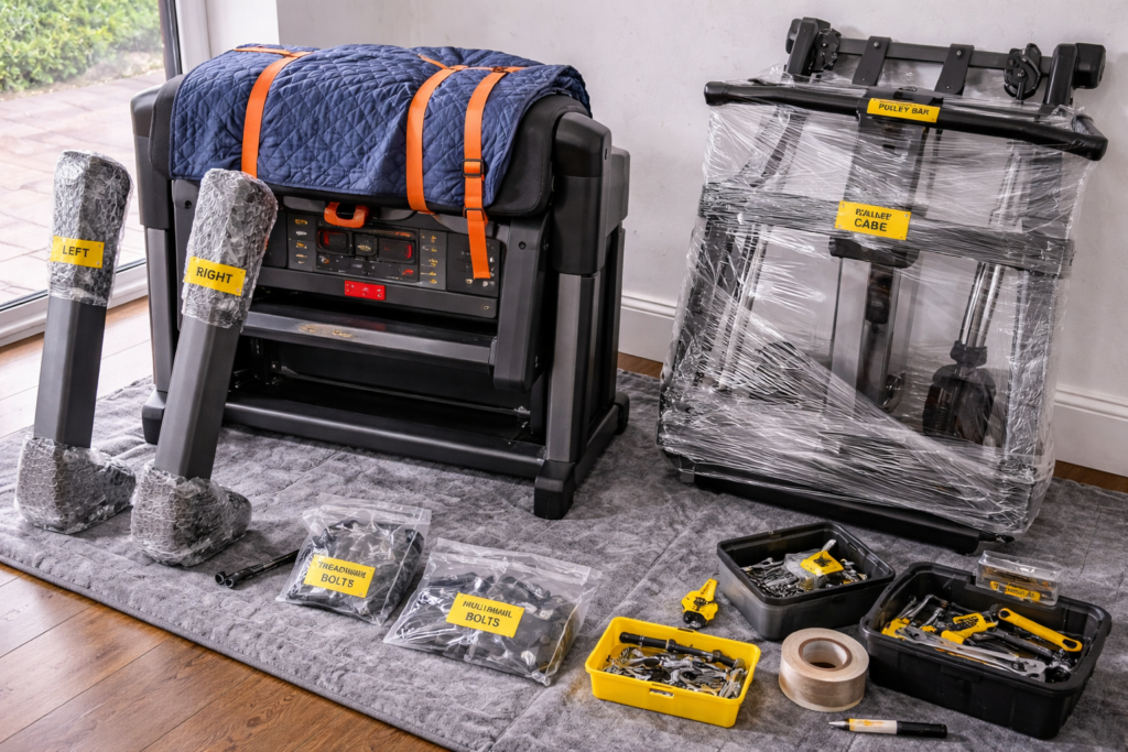 Partial disassembly can help with treadmills, benches, racks and larger multi-gym units where doorways, stair turns or vehicle loading height make a full-item move less practical. The aim is to reduce risk, protect the machine and make handling more controlled.